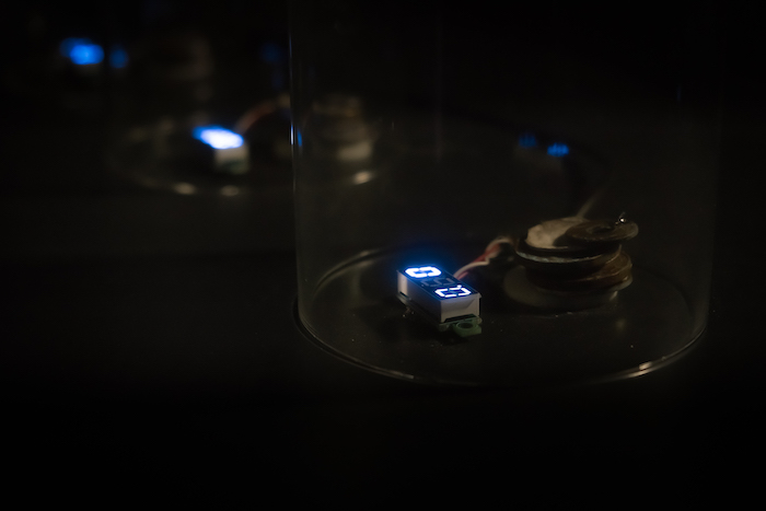 Electricity, Light and Money Without Us is a work using power generators operating on the basis of the “penny battery” mechanism to power a series of measuring devices. The work literally process money (coins) into electricity and somehow examines the “final” value – the energy potential – of money. At a time of the dematerialization of money and the emergence of its new forms, such as cryptocurrency, the work perversely takes obsolete media – coins, representing even completely worthless currencies (often the price of raw material and the cost of producing coins in these currencies are higher than their purchasing power). Words “electricity,” “light,” and “money” often appear in pairs containing two words from the triad. Each of the pairs seems quite obvious, because they are basically mutually convertible resources. At the right moment, access to the specific resource from the set can be a matter of survival or death. They all have a long history of connections with power, violence, and civilization changes. Each of the elements of the triad have served as an axis around which to create religions, political systems (early communism approached electrification in political rather than in technical terms), and scientific disciplines. Currently, each of these resources also occurs in a symbolic or substitutive form: electricity exists more in relation to information than to energy; light is no longer a range of electromagnetic spectrum received by the eyes, and, instead, a much more complex, physical phenomenon; money has lost the parity of gold and even materiality. In addition, these resources have become more and more autonomous (even money, which nevertheless seems to be a human creation), and they may be able to do better without us than we do without them. They can play their own games in which humanity is cheap and can be a superfluous resource. * * * Video documentation from the Point Nemo by Mira Boczniowicz courtesy of the WRO Art Center.