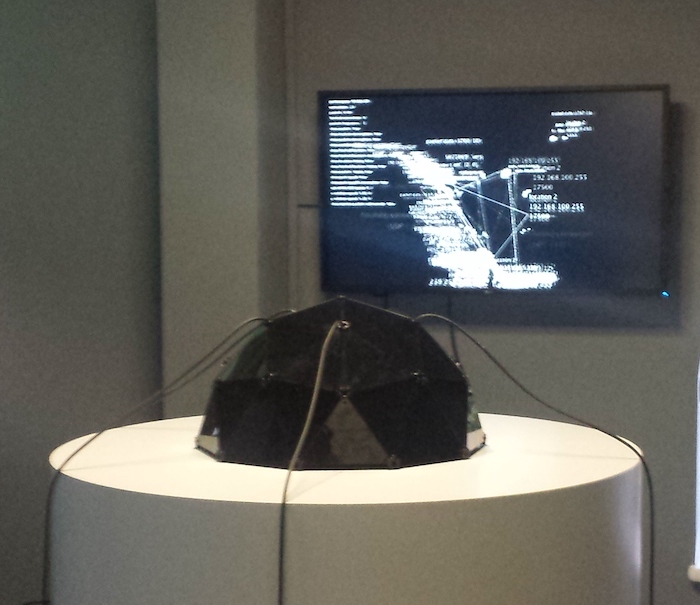 "Vibra v. 3" - a geodesic dome-shaped interactive object which uses bone conduction to sonify real-time data flow transmissions and brings an unusual experience of sound. Vibra v. 3 @ WRO Art Center A geodesic dome stands also for the form that can be read in the context of other ideas by Buckminster Fuller (who – by referring to Plato’s theory of forms – has worked out a mathematical formula to describes conversion of the sphere into the characteristic solid shape made of adjacent triangles); he viewed the Earth as a homeostatic entity traversing the space, and believed in the humanity’s survival and further existence on the inner equilibrium and capacity of its constitutive elements for mutual support. The geodesic dome is a unique material embodiment of a code-based thinking: it is a sensual (sensorially accessible only) programme for the matter which reminds that digitality – as derived from digitus, Latin for a finger – bespeaks also physicality, touch, scanning of the body parameters and self-knowledge. Vibra as an interactive installation went through several versions, from which two emerge as independent development paths: “Vibra v. 2” and “Vibra v. 3”, i.e. systems which use real-time Internet and satellite data as a building material for the creation of the generative sound structure. In addition, the installation titled simply "Vibra” – which uses bone conduction to distribute sound in a generative (but not using external data sources), 6-channel musical composition – was included in the Interactive Playground exhibition, and is both directed at the youngest audience and a well cognitive experiment: an attempt to reach to people who can not receive audio works for various reasons in the traditional way.
